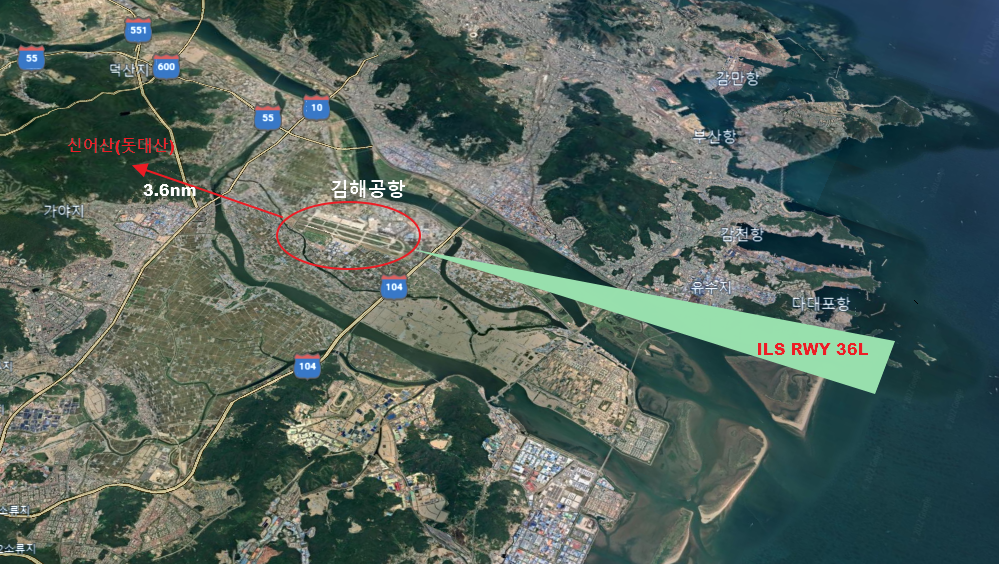 시정이 나빠서 베이스 턴을 늦게 한다거나 활주로에 바짝 붙어서 선회율을 유지하지 못하면 바로 위쪽의 돗대산에 부딪힐 위험이 있다.
