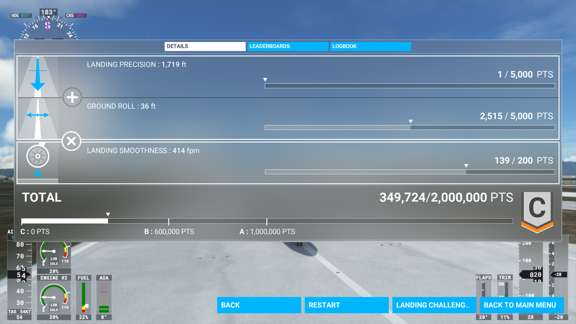 이 비행이 랜딩이 아니라 랜딩 첼린지인 이유는 착륙의 정확도(좌/우, 접지 거리)와 접지 속도를 기준으로 평가를 해주기 때문이다.