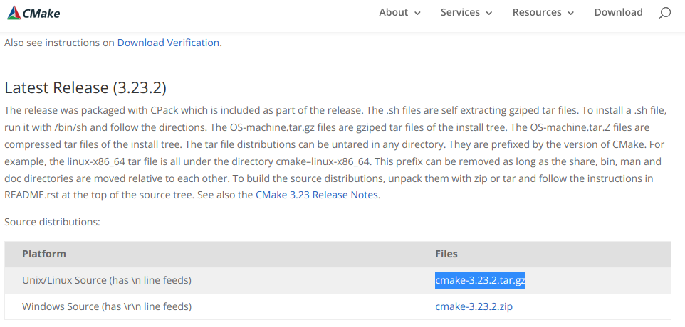 먼저 https://cmake.org/download/ 로 이동하여 cmake 최신 버전을 다운로드한다.