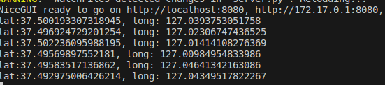 그러면 지도를 클릭할때마다 터미널에 해당 위치의 위도, 경도를 출력하게 된다.