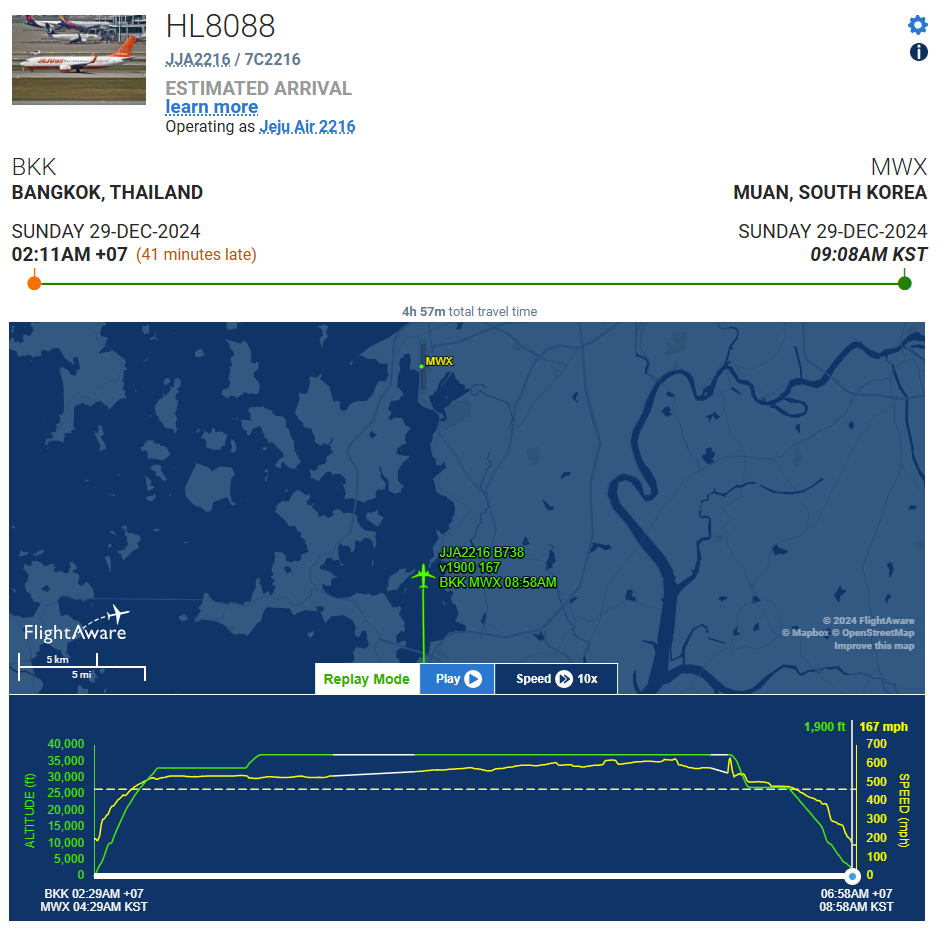 29일(현지시각) 새벽 1시30분 타이(태국) 방콕에서 이륙한 제주항공 여객기(7C 2216)는 방콕 수완나품공항을 출발해 아침 8시30분 무안국제공항에 착륙할 예정이었다. 국토교통부 항공정보포털시스
